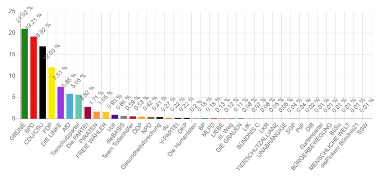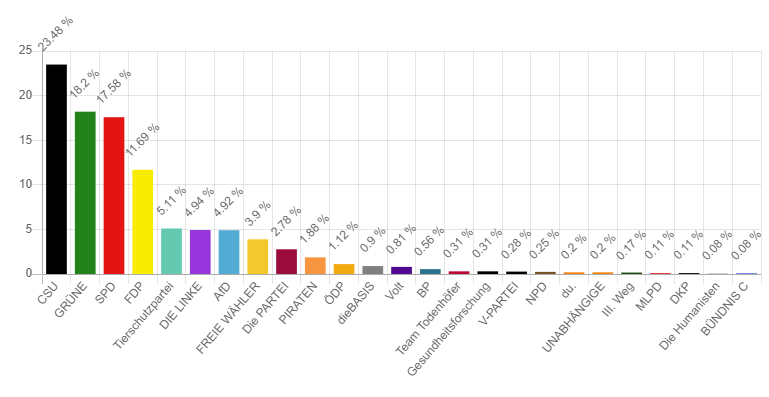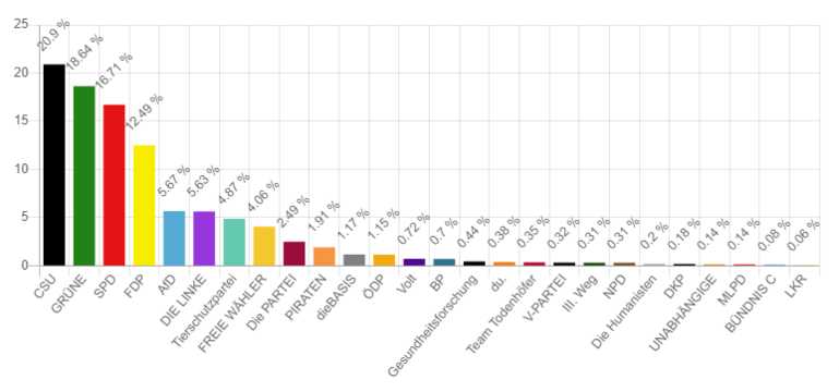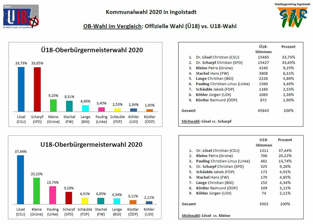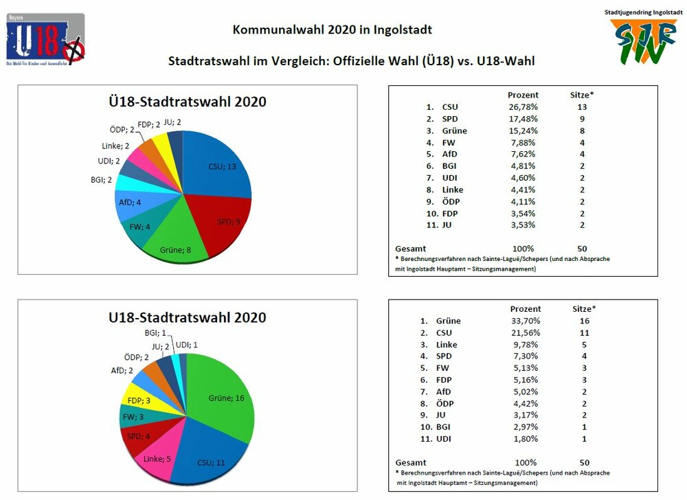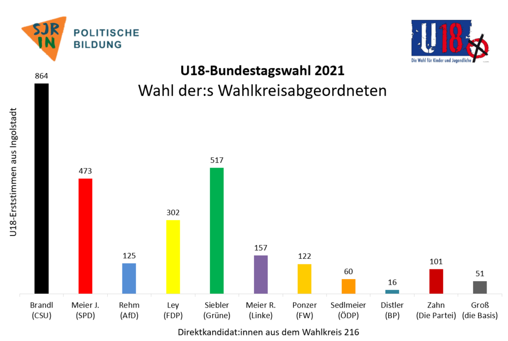 Am 17. September haben etwa 30 % der Kinder und Jugendlichen Ingolstadts ihre Stimme bei der U18-Bundestagswahl abgegeben. Die Ergebnisse aus den 14 Wahllokalen stehen nach Auszählung aller Stimmen fest: Reinhard Brandl holt sich das Direktmandat mit 864 Stimmen, gefolgt von Joachim Siebler mit 517 Stimmen und Jessica Meier mit 473 Stimmen. Die CSU in Ingolstadt hat mit 23,5 % die meisten Stimmen im Wahlkreis 216 Ingolstadt gewonnen. Danach folgen die Grünen mit 18,2%, SPD mit 17,6 %, FDP mit 11,7 % und die Tierschutzpartei mit 5,1 %. Die Linke und die AfD verfehlten knapp die 5%-Hürde.