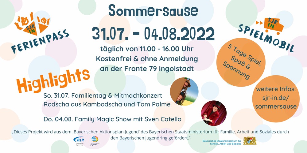 Vom 31.07. bis zum 04.08. veranstalten der Ferienpass und das Spielmobil vom Stadtjugendring Ingolstadt gemeinsam eine große Sommersause! 5 Tage Spiel, Spaß und Spannung rund um die Fronte 79 in Ingolstadt.